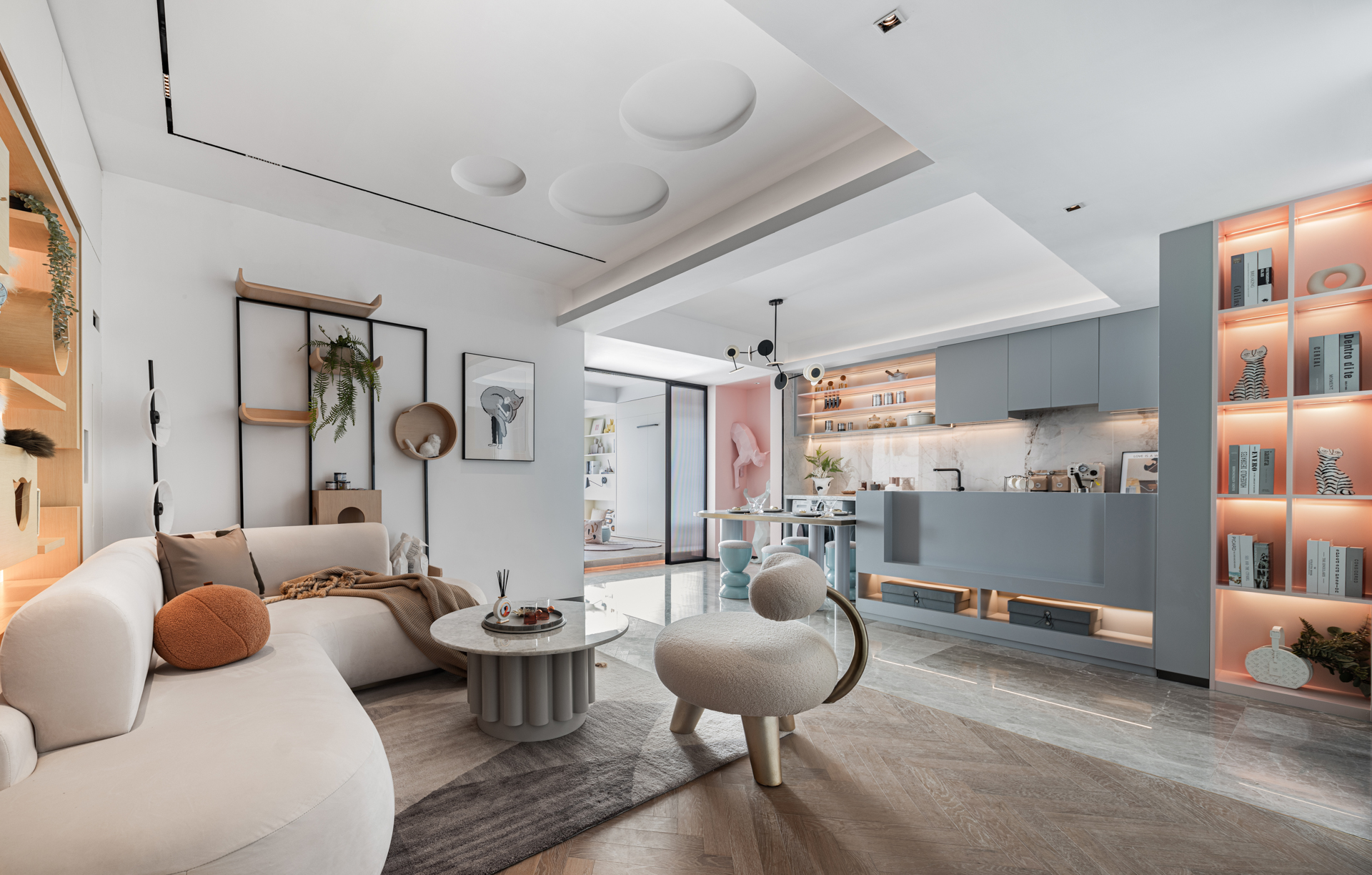 开放式厨房与客厅空间整合,休闲区背景墙巧妙融合猫爬架,绿色植物与猫的活动空间相辅相成,搭配现代前卫的个性化家具为起居室增添了几分趣味。主卧室设置了休闲吊椅,闲暇之余手捧书本在吊椅上悠闲自得,主卧衣柜内部隔板设置了可以容猫通过的洞口,“铲屎官”即便在卧室也依然可以看到猫在衣柜中爬上爬下。