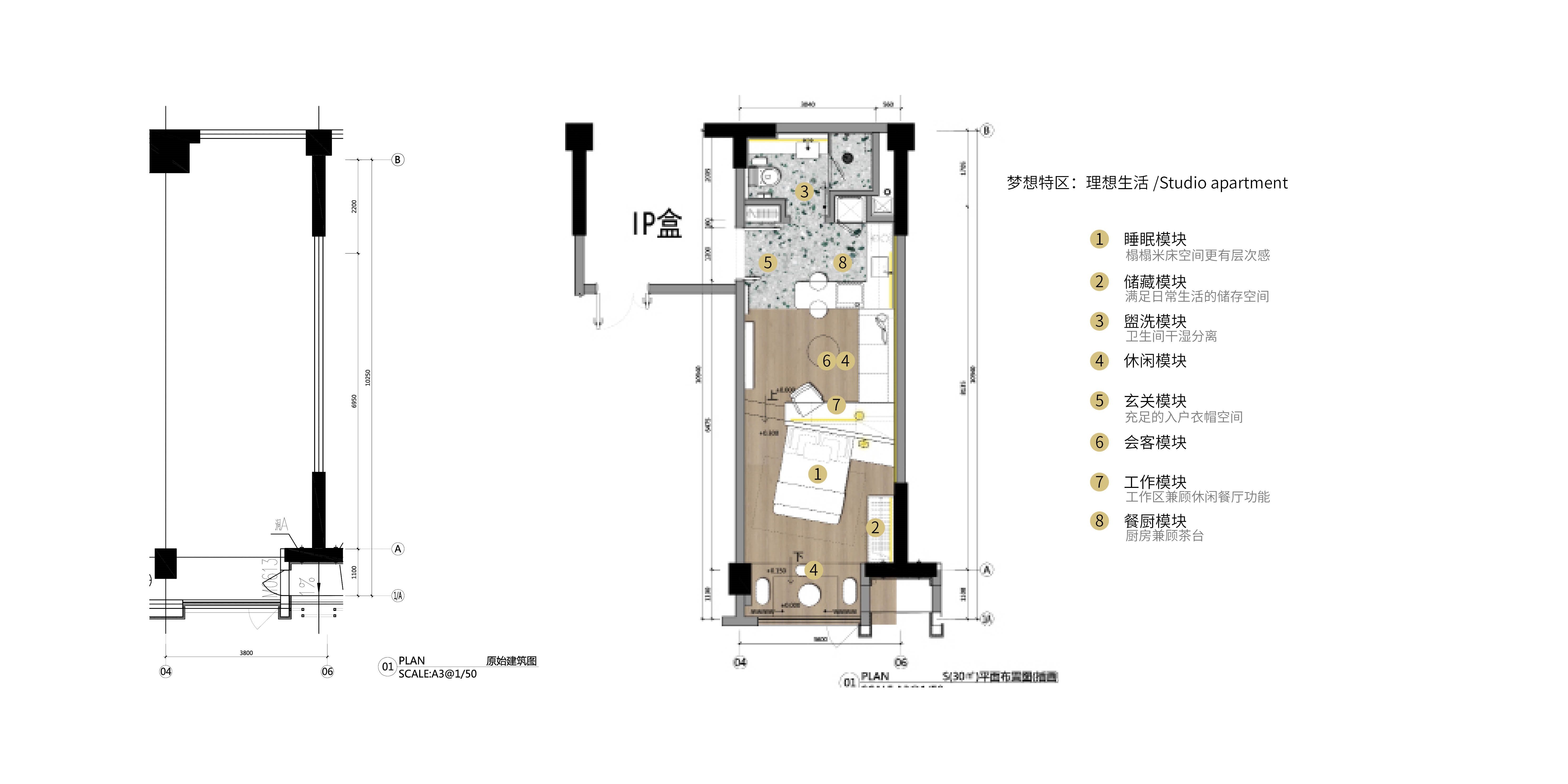 入口正对的是开敞厨房及衣帽柜,开放式厨房与餐厅结合,布局紧凑合理,使用空间开阔。往右挨着厨房的是半围合的客厅和开敞的卧室区,客厅与书房结合,更集约的利用空间,并配备投影仪、围合沙发区等娱乐设施,拥有良好的工作及休闲体验。卧室区采用榻榻米样式,让睡眠更踏实,床头与客厅书桌工作台结合,功能紧密,形式美观,床尾对窗,营造了极佳的观景视线,入口左侧为独立卫生间,卫生间采用干湿分离的布局。