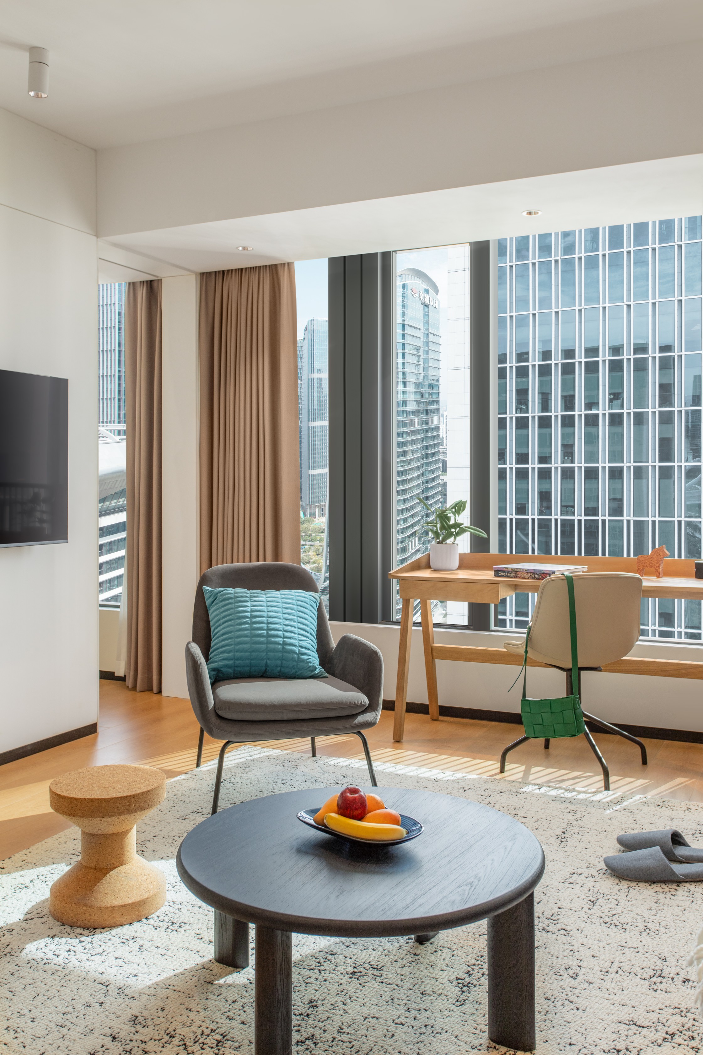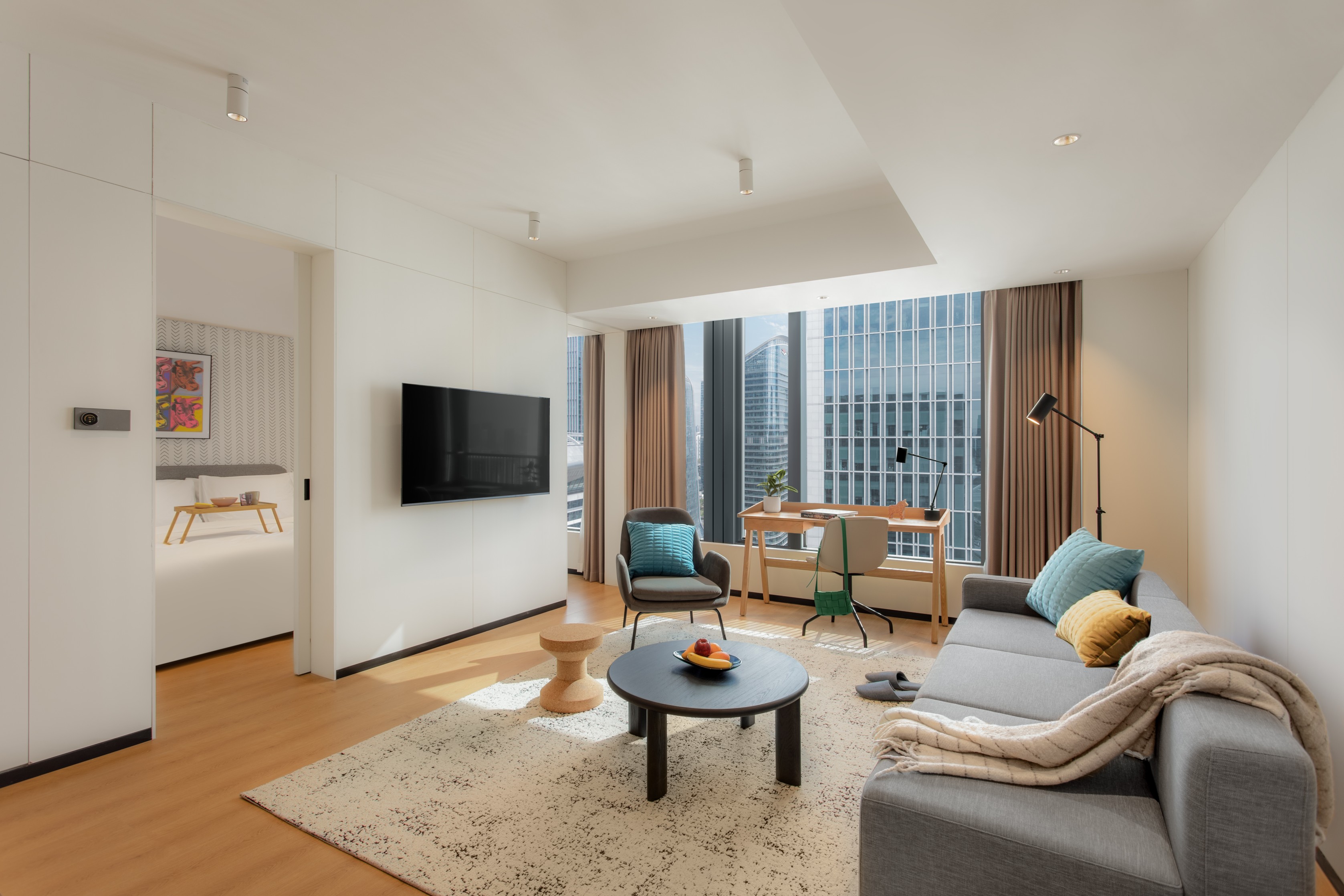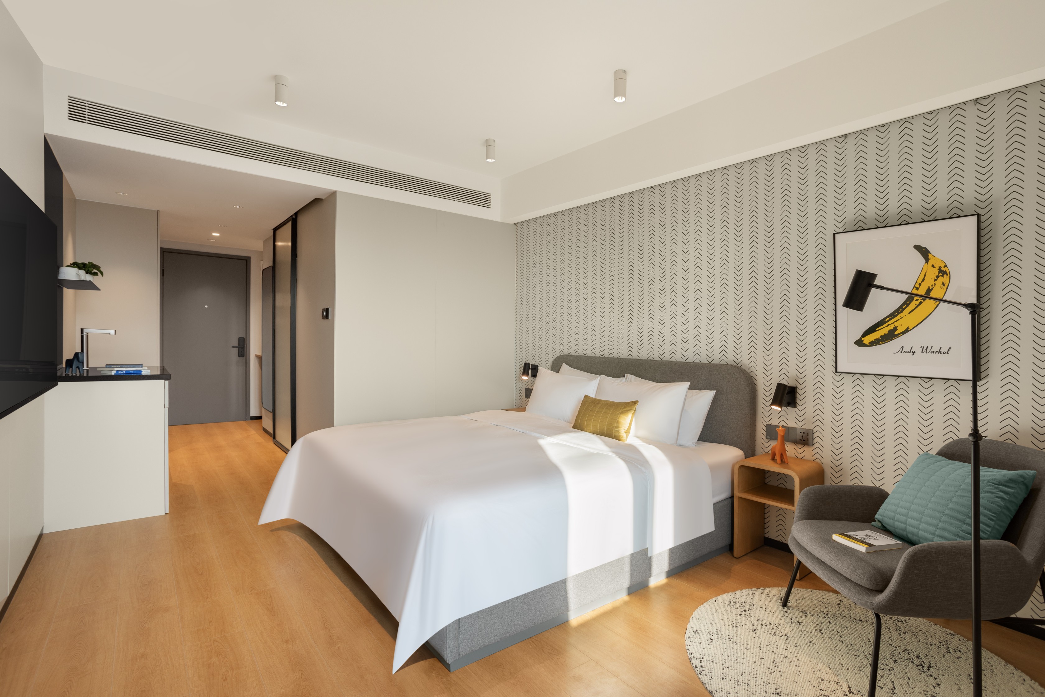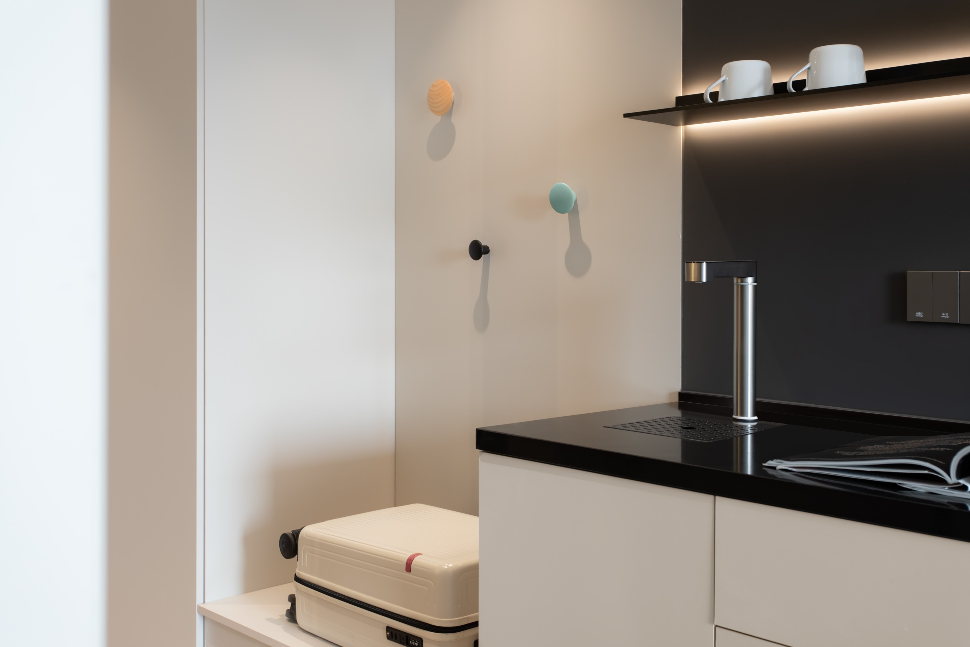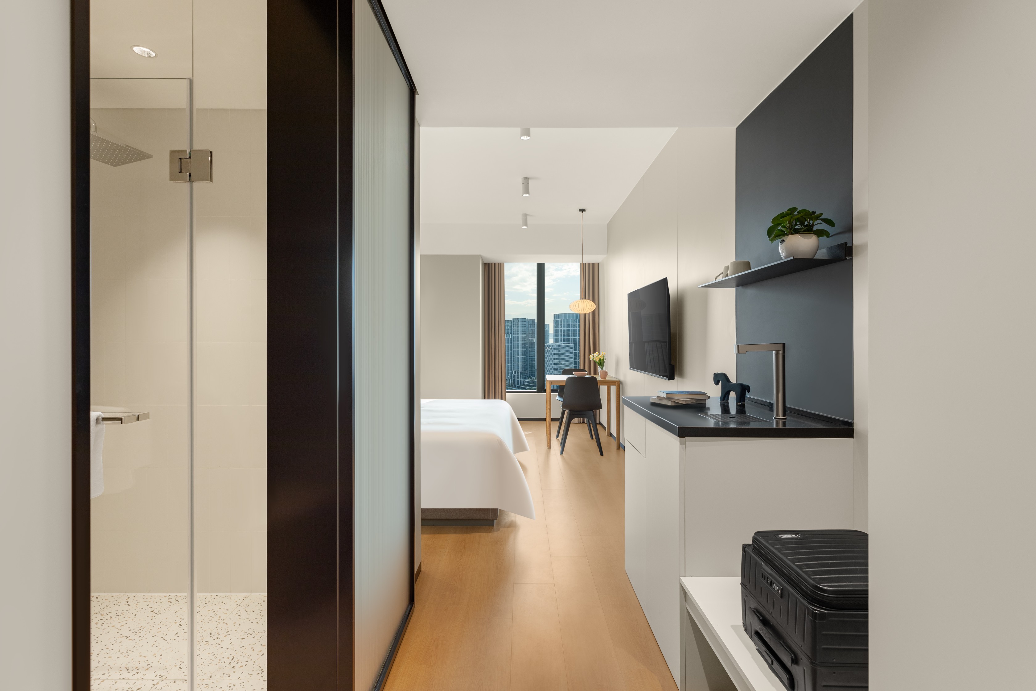 酒店的空间适变性设计是对于城市动态生活的主动响应。酒店客房采用了创新的“空间模块化”设计,通过转租柜模块的研发,实现了“长租公寓”与“短租酒店”模式的无缝切换。长租客可以将租期内某一闲置时段的房间转租给其他人,所有为长租客人预备的收纳柜将自动上锁保证财产安全。转租柜模块将开启为短租客人提供必要的酒店服务。
