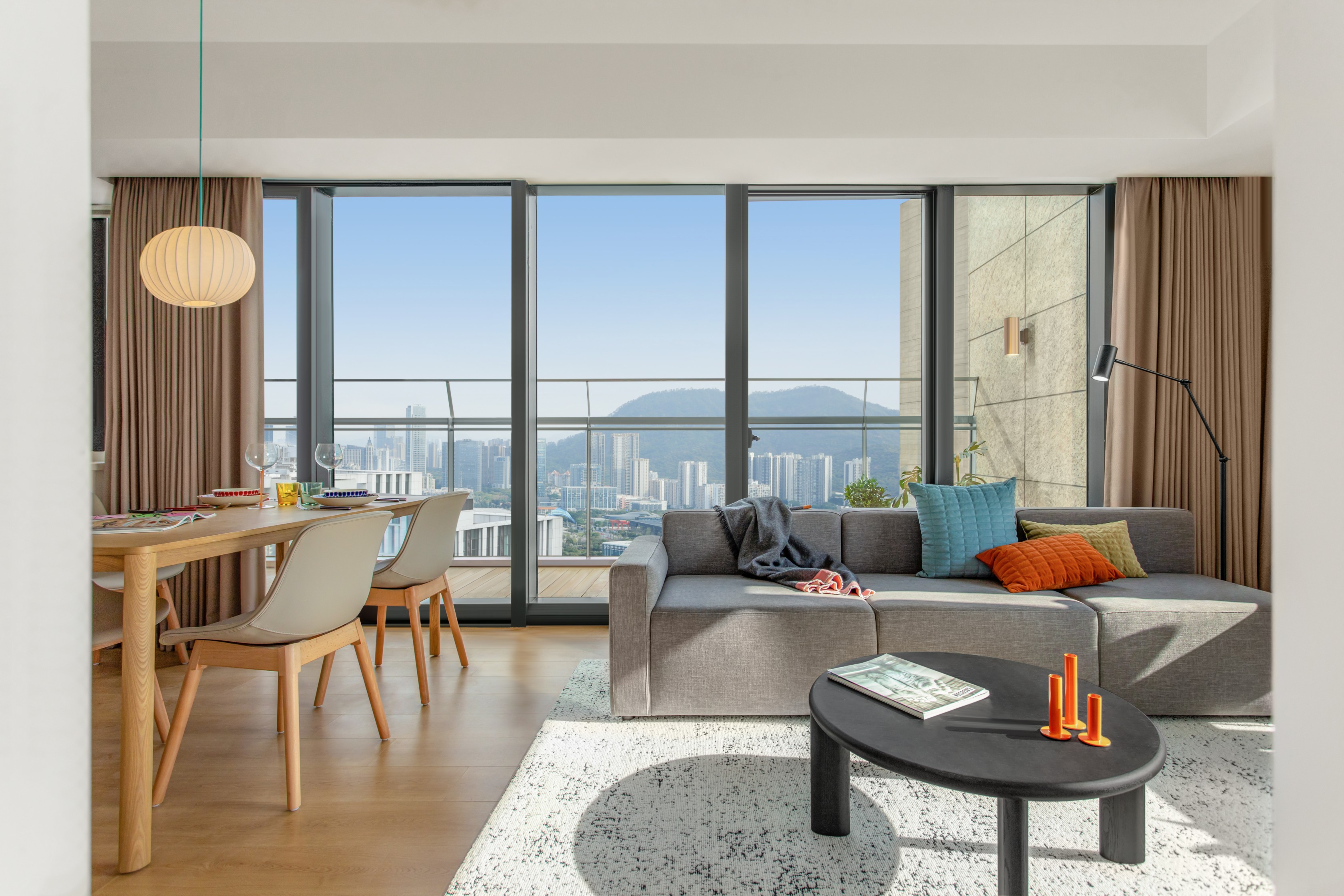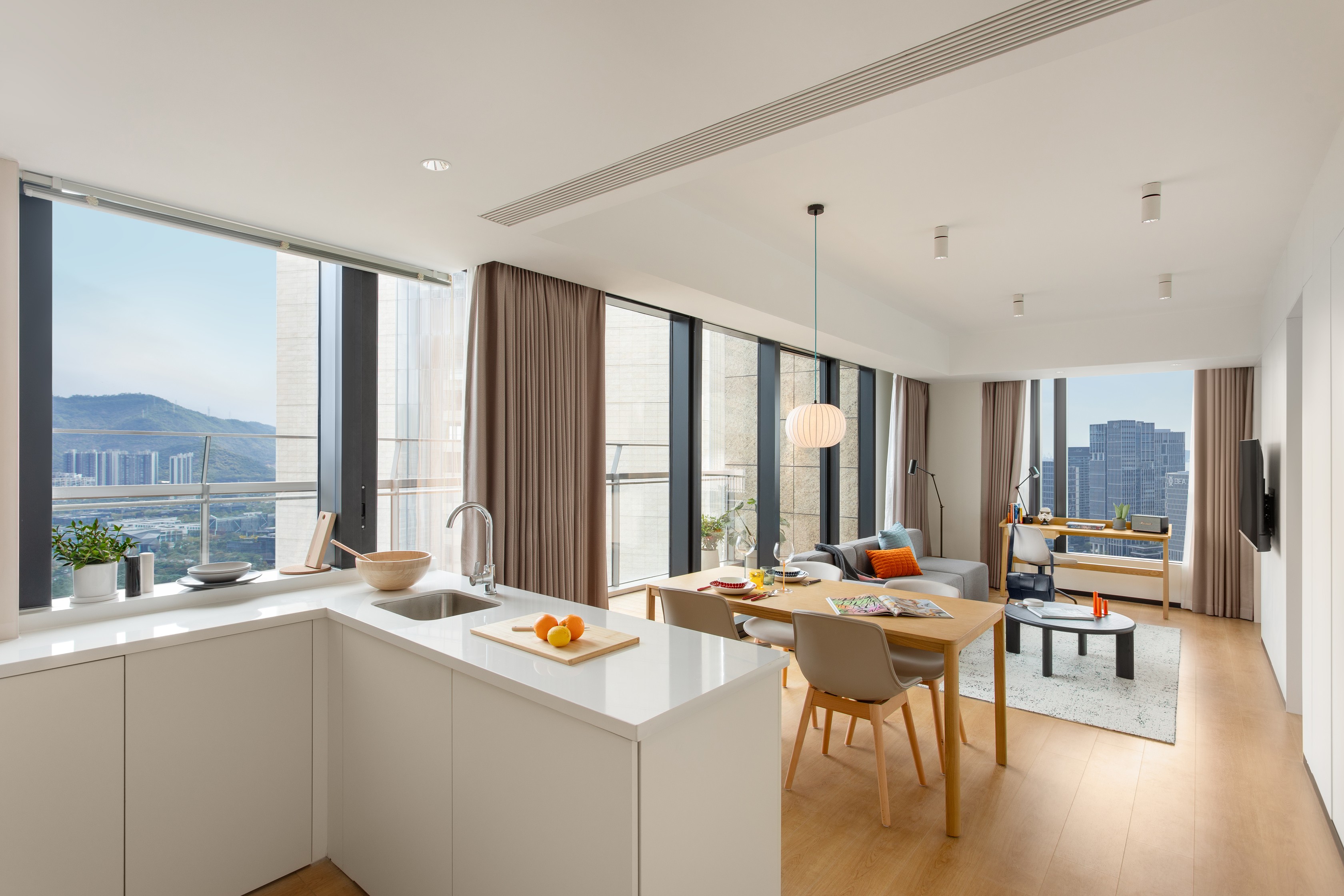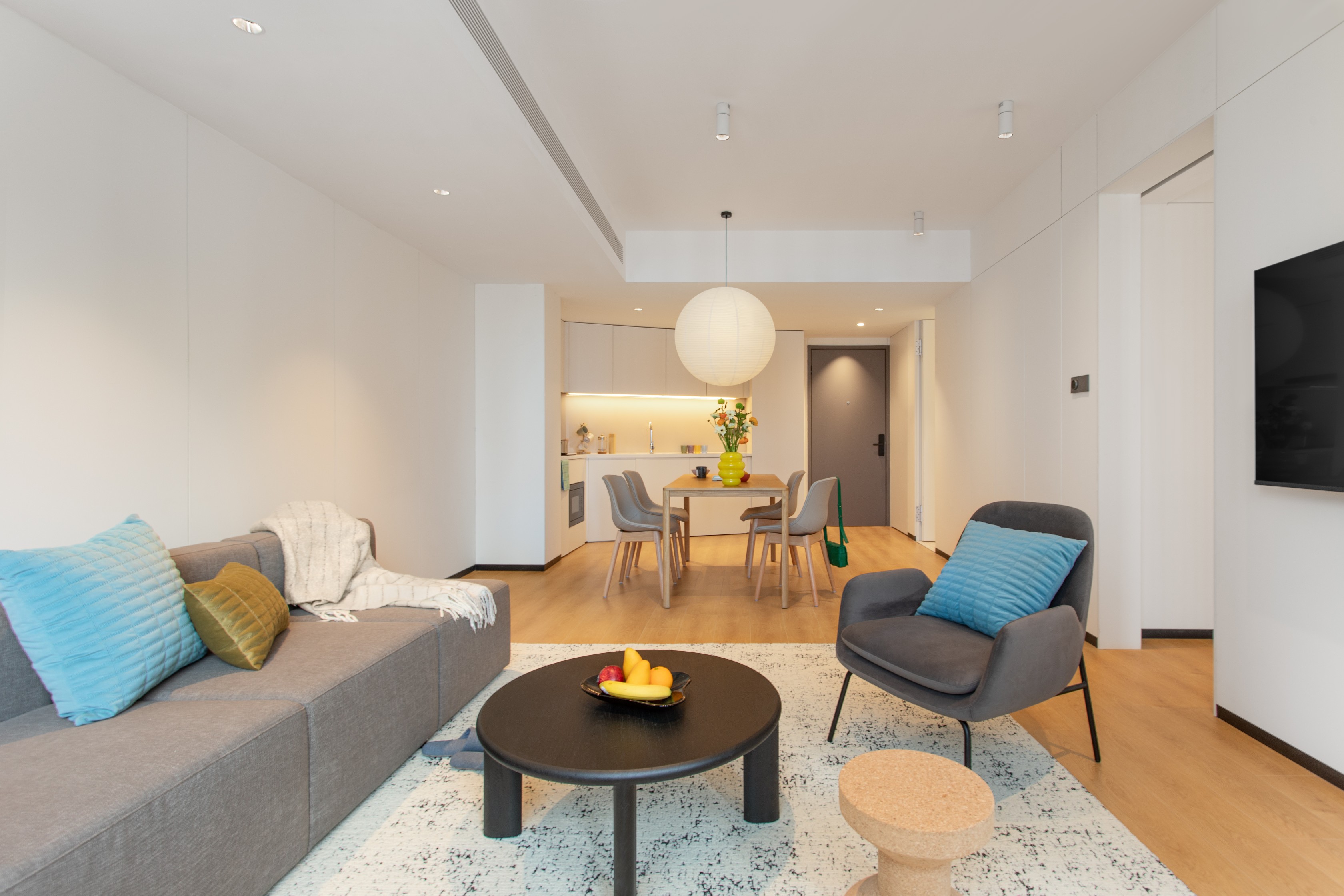 简洁白饰面、自然色调的木色、灰色系的织物,搭配柔和的中性色调,营造出北欧设计的温暖与宁静感;在功能性上收纳系统、家具选择和厨房设计结合亚洲居住者对实用性的需求,同时将北欧设计的精致与极简美学融入细节;