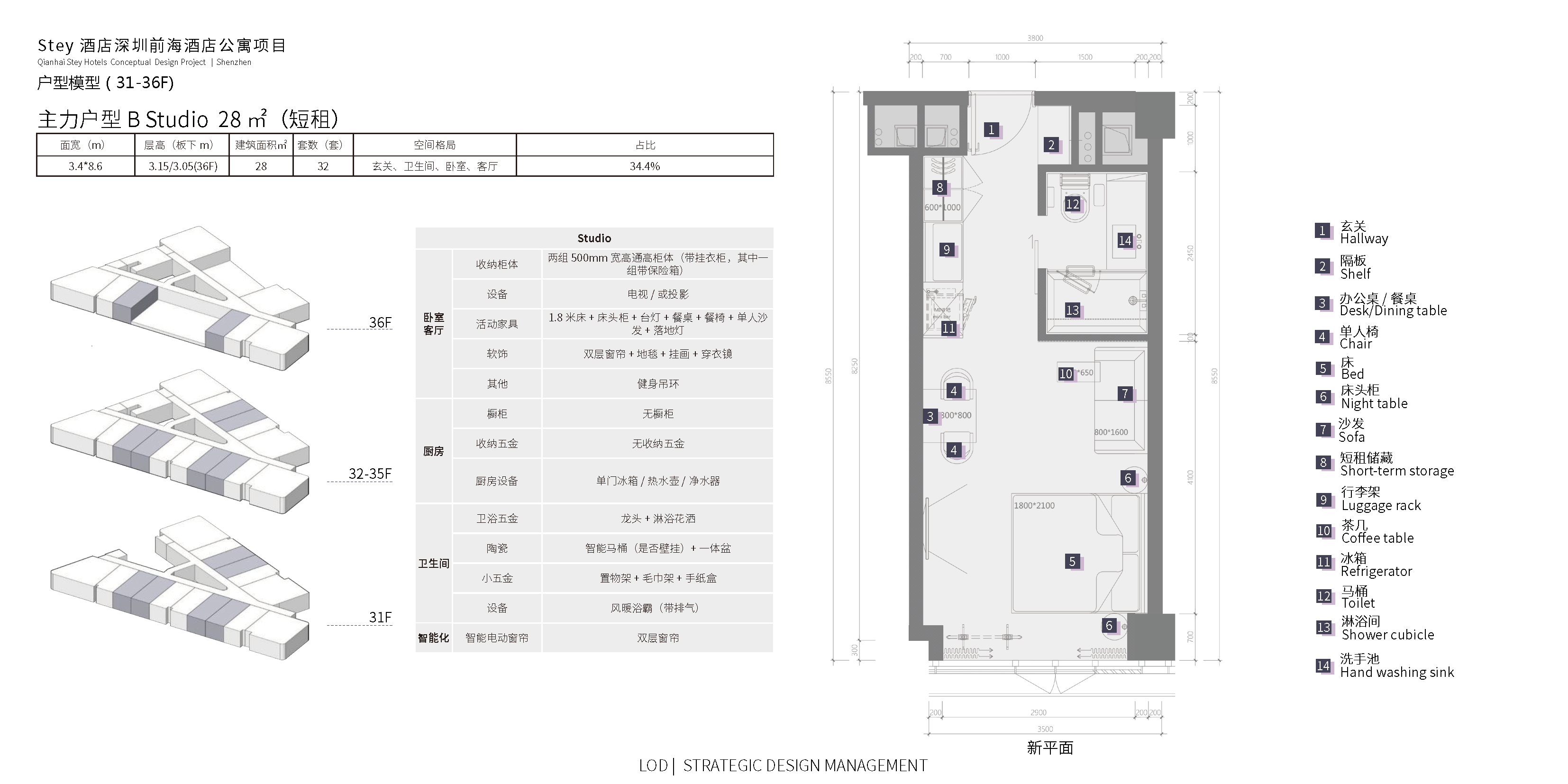 Studio长租户型平面 ,Studio Room Plan
