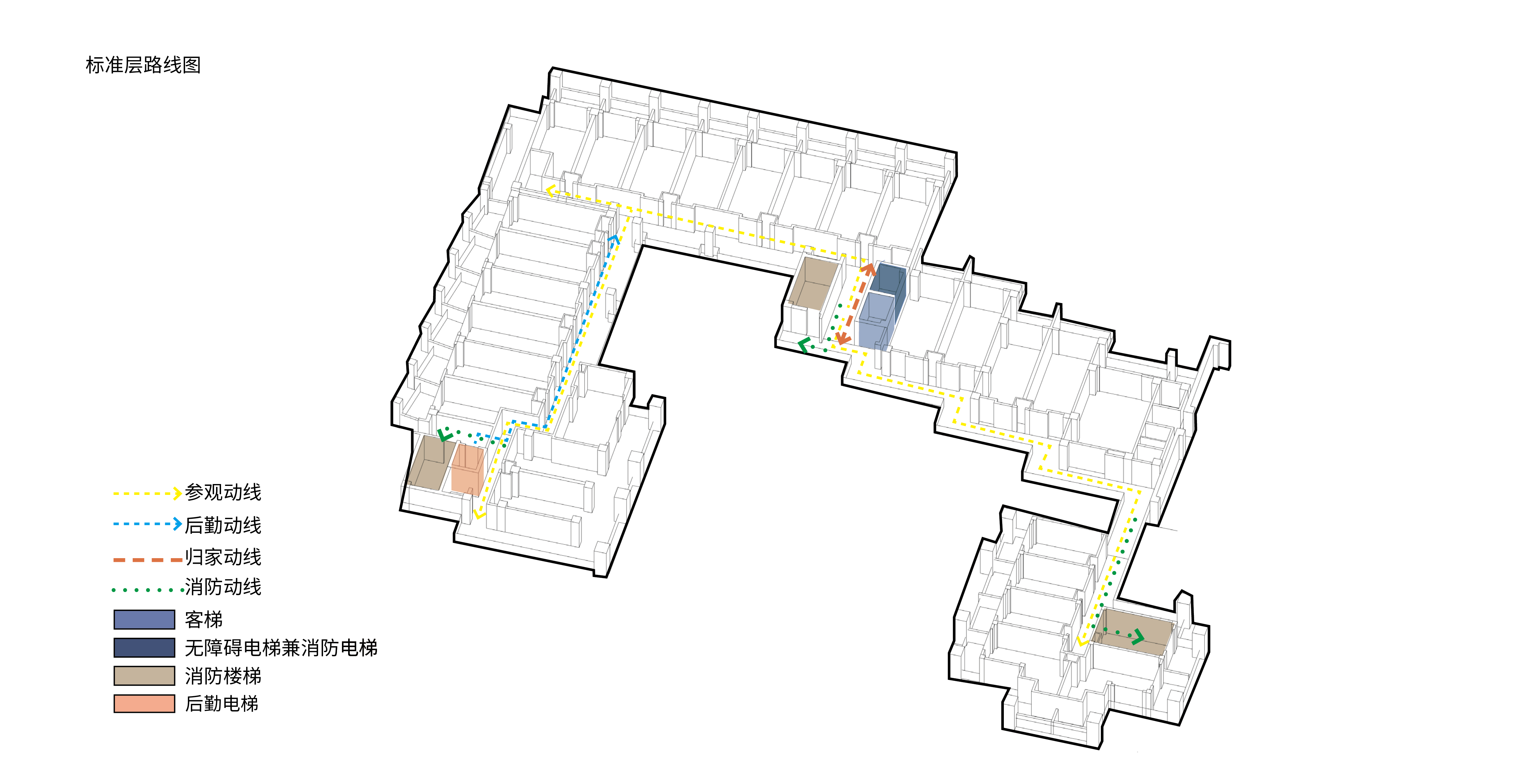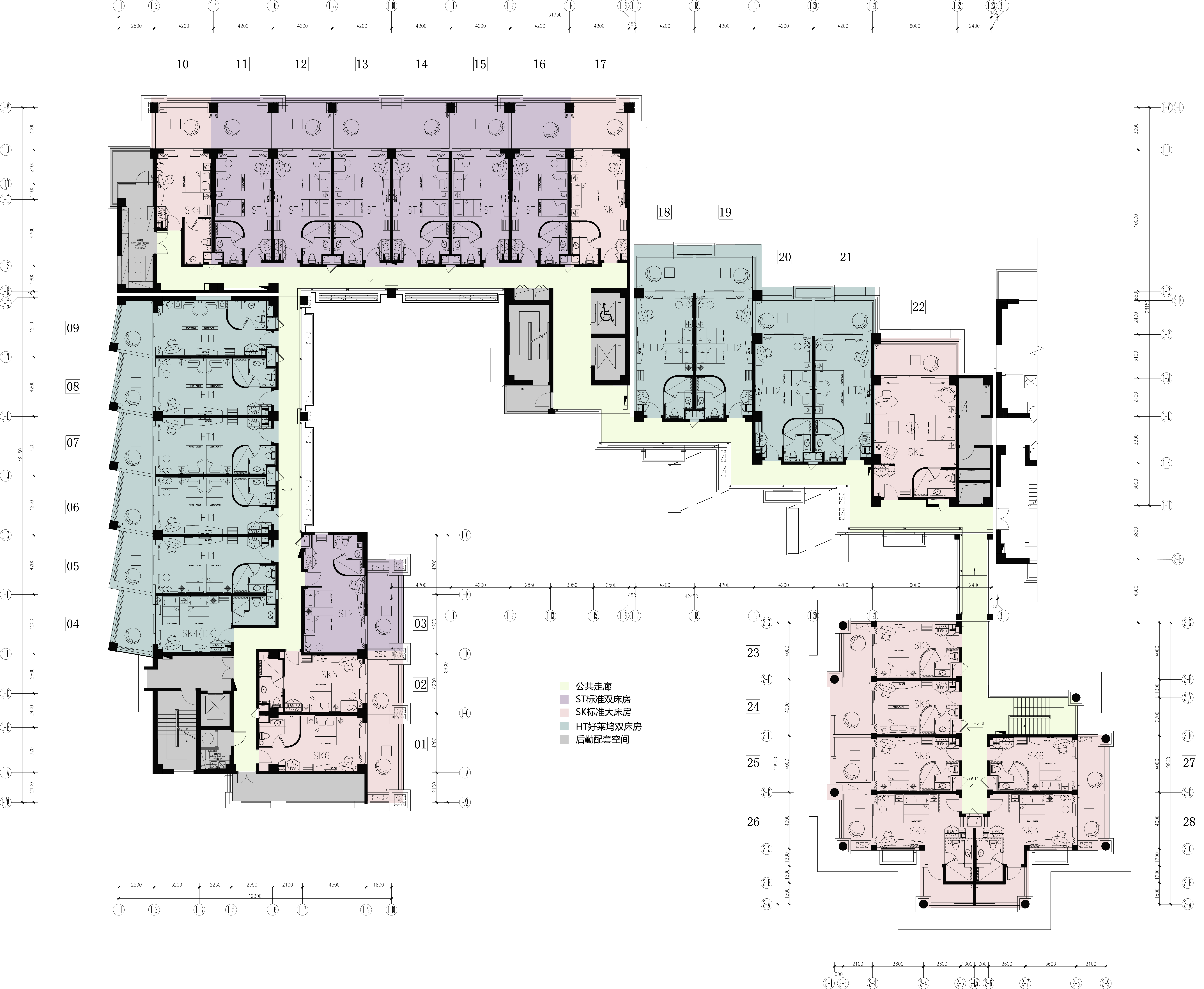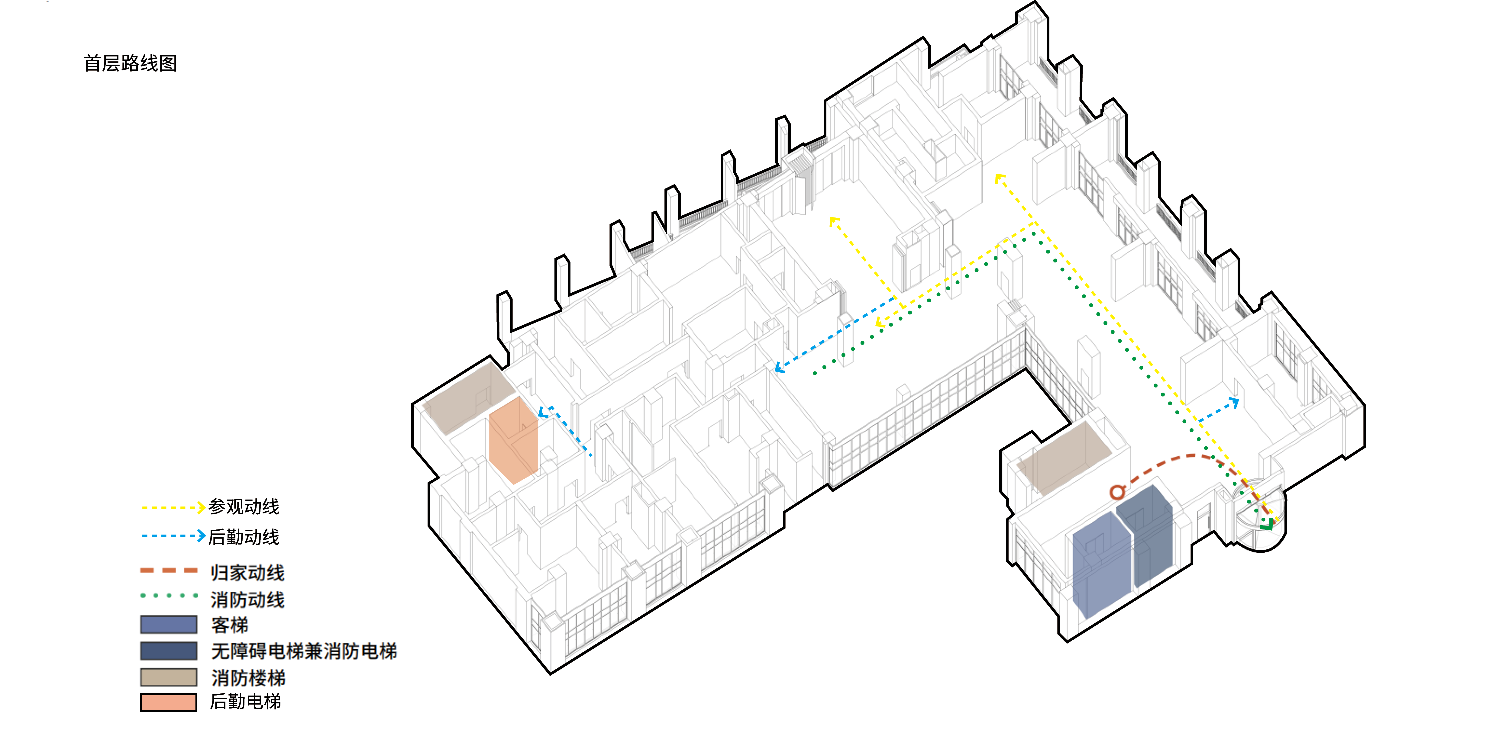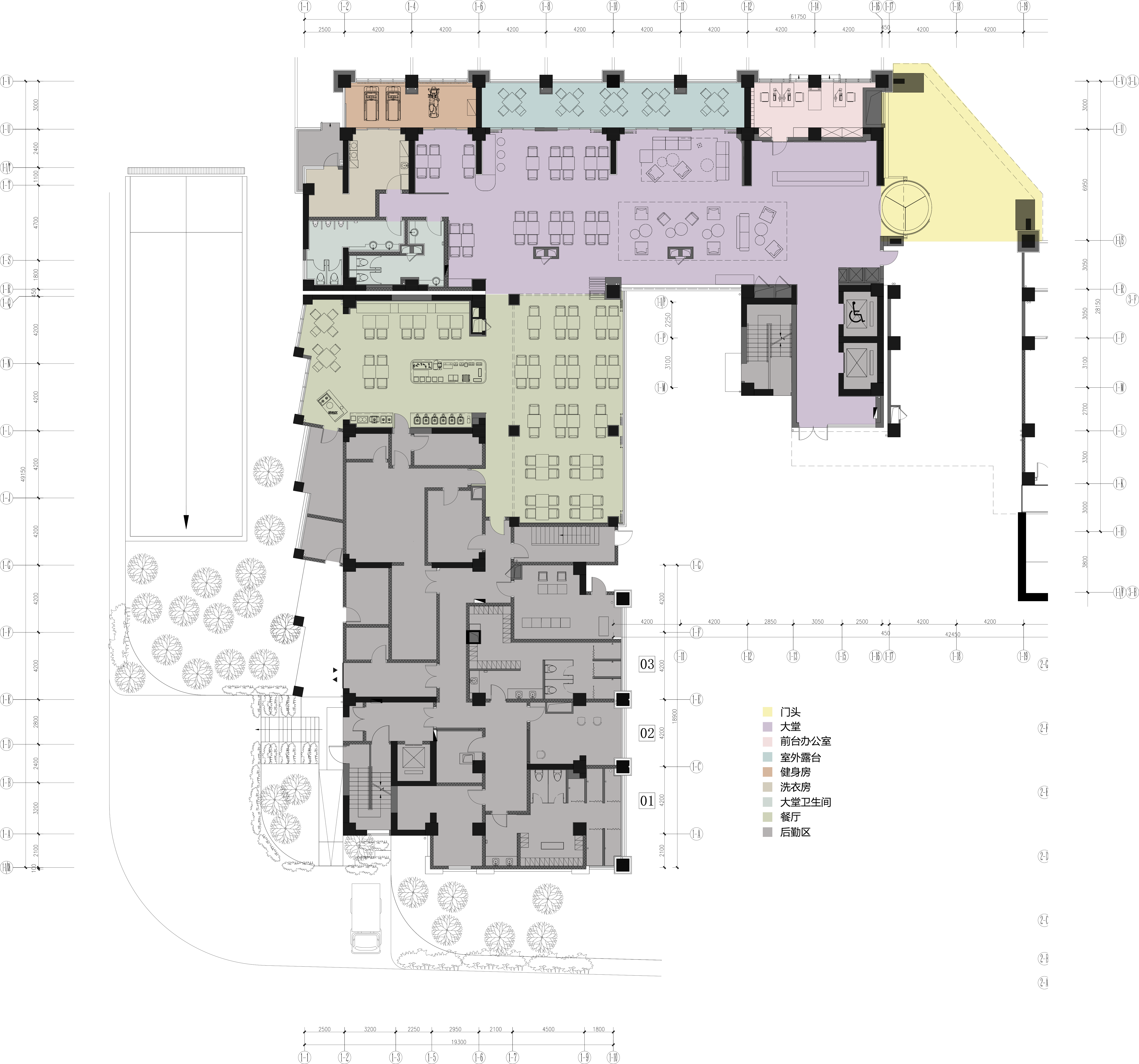 本次改造A段区域, 包括1#、2#、3#、9# 四栋楼,一层公共空间位于1# 和2# 楼首层,空间规划了大堂接待、休息区、早餐厅兼多功能厅,卫生间、健身房、洗衣房及客房区,给客群以服务配套;