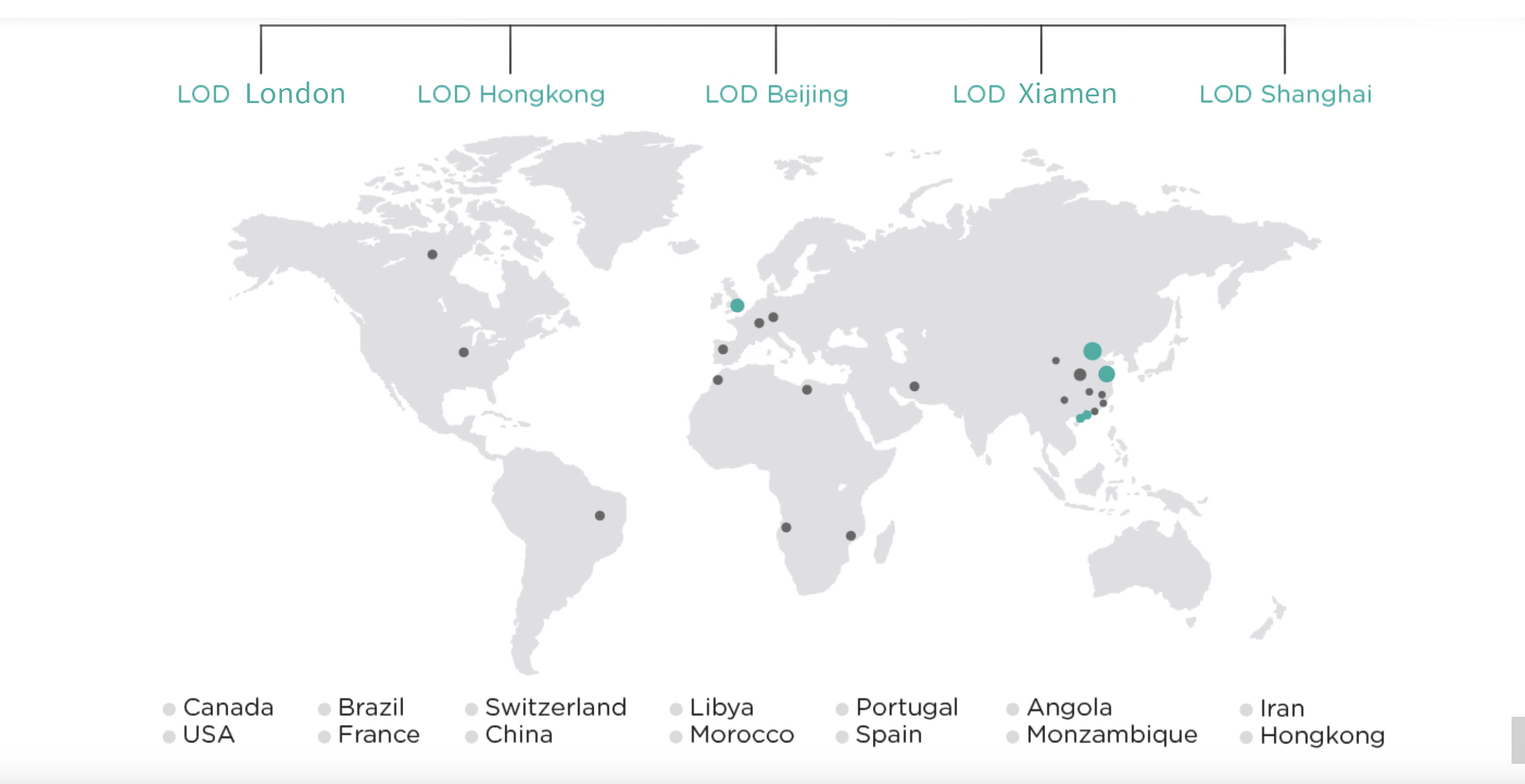 LOD设计团队基于西班牙巴塞罗那、中国北京、深圳、上海、中国香港多地展开全 行业全案设计咨询服务。在中国各地包括北京、上海、广州、深圳、杭州、南京、宁波等城市完成系列知名建筑、酒店、商业综合体、品牌建设及设计咨询项目。